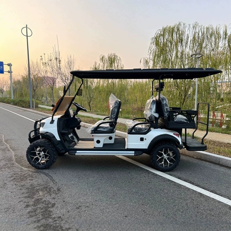 这款高尔夫球车采用四座布局,白色车身搭配黑色车顶,外观时尚,兼具越野性能。它配备大型越野轮胎和黑色轮毂,以及黑色前护栏,增强了安全性和越野能力。该车搭载高效电机,续航里程可达80-100公里,最高时速为20-30公里/小时。独立悬挂系统配备液压阻尼装置和四轮液压制动系统,确保行驶平稳安全。座椅采用真皮包裹,舒适度极佳,并配备完善的照明系统。可选配置包括音响系统和USB接口。这款高尔夫球车适用于高尔夫球场、风景区和度假村接送服务,能够轻松应对非铺装路面,为用户提供灵活舒适的短途出行体验。