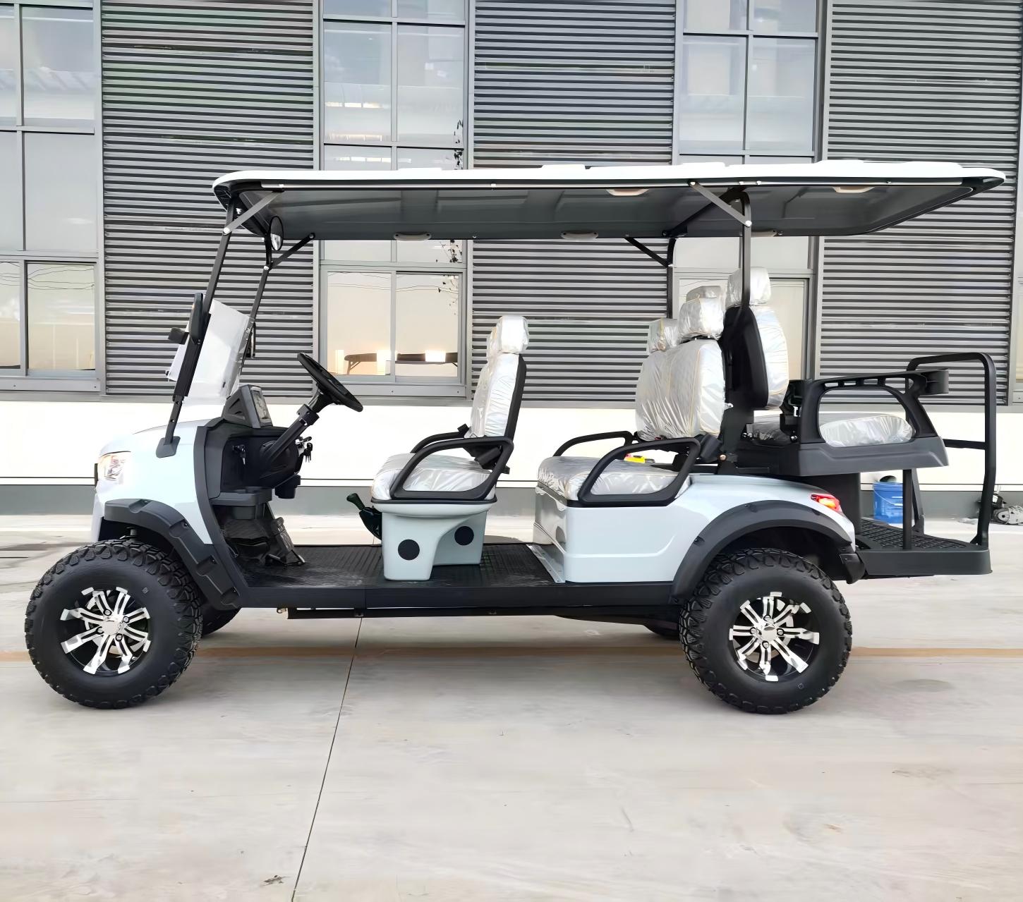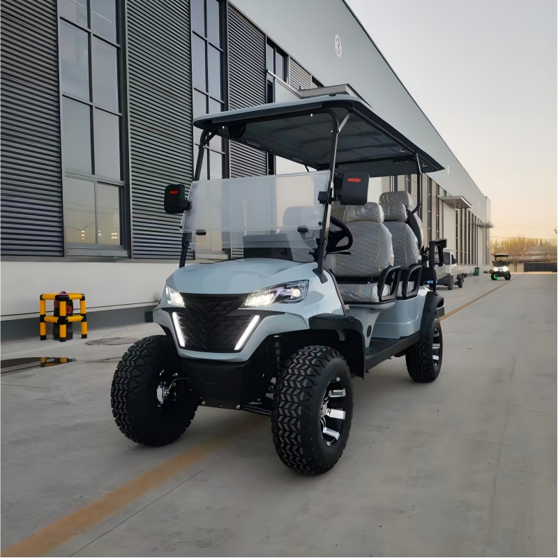 强化底盘框架:采用高强度碳钢焊接一体式车架,并经防锈耐腐蚀粉末涂层处理,该底盘具有极强的抗扭和抗弯强度,能够承受复杂路况下的持续冲击。最小离地间隙为150-180毫米,其越野性能远超传统高尔夫球车,轻松应对碎石、泥泞和坑洼路面。