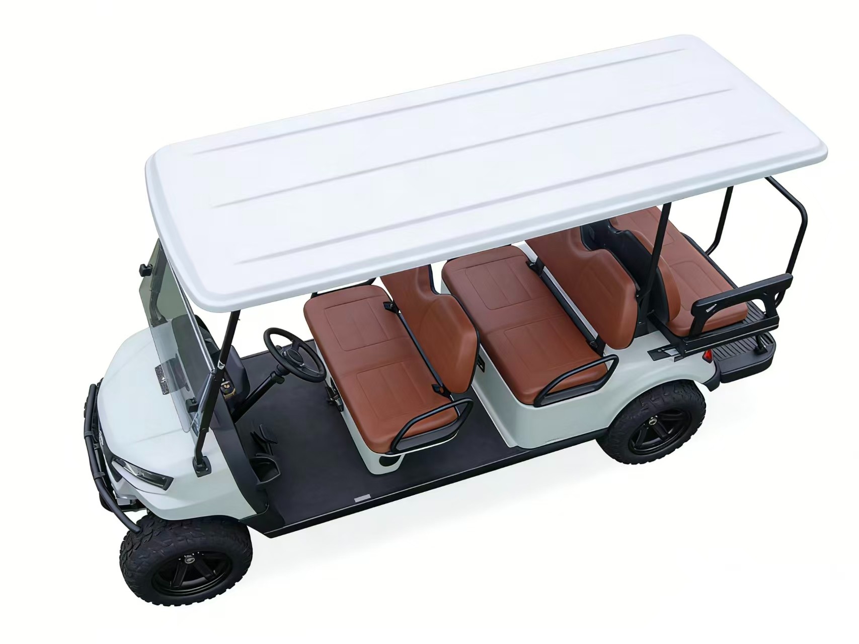 Sleek Exterior: Features a white body and roof, paired with classic brown seating—blending modern style with functional durability.