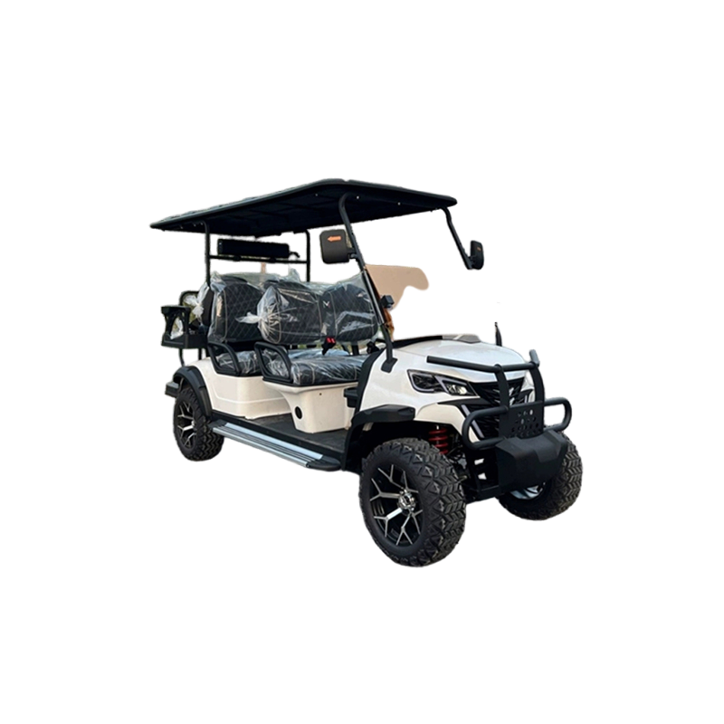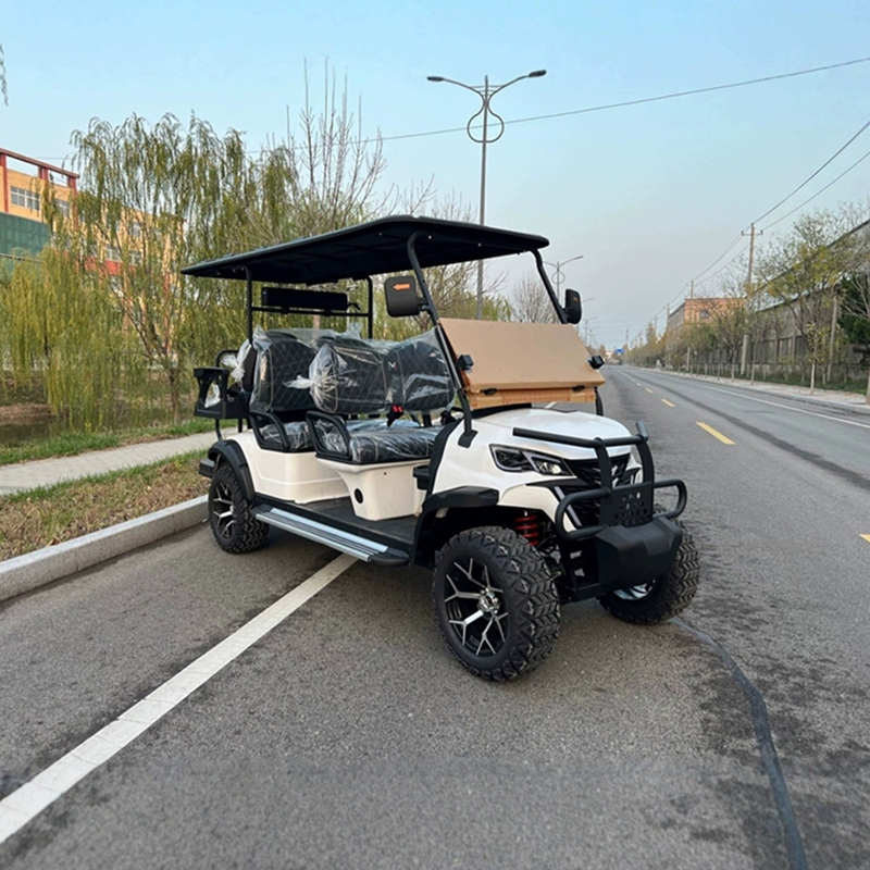 This golf cart features a four-seat layout, a white body with a black roof, a stylish and off-road design, large off-road tires and black rims, and a black front guardrail for enhanced safety and off-road capability. It is equipped with a high-efficiency motor, offering a range of 80-100 kilometers and a top speed of 20-30 km/h. Independent suspension with a hydraulic damping system and four-wheel hydraulic brakes ensure a smooth and safe ride. The seats are upholstered in leather for comfort and include a comprehensive lighting system. Optional features include a sound system and USB ports. Suitable for golf courses, scenic spots, and resort shuttles, it can navigate unpaved roads with ease, providing users with a flexible and comfortable short-distance travel experience.