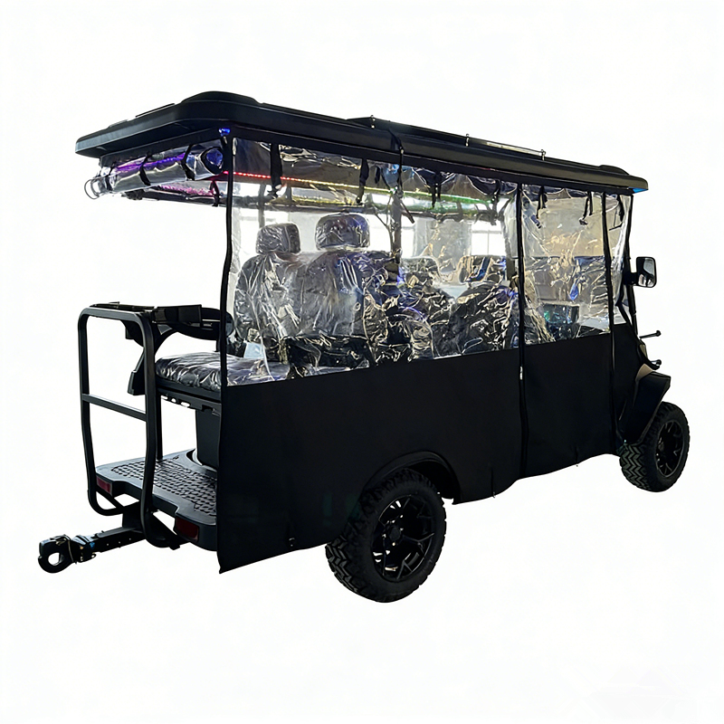 Оснащена съемными прозрачными шторками, обеспечивающими ощущение простора и защиту от ветра и дождя, адаптируясь к различным погодным условиям (например, к переменчивой погоде на полях для гольфа/туристических достопримечательностях).